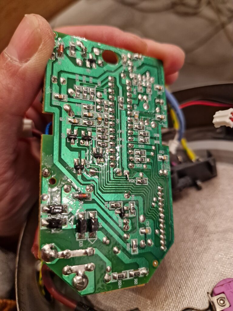 Preuve supplémentaire de l’obsolescence programmée ? L’utilisation d’une vis anti-ouverture (tête spéciale) sur la base. Le fabricant ne veut vraiment pas que vous répariez son vice de conception !