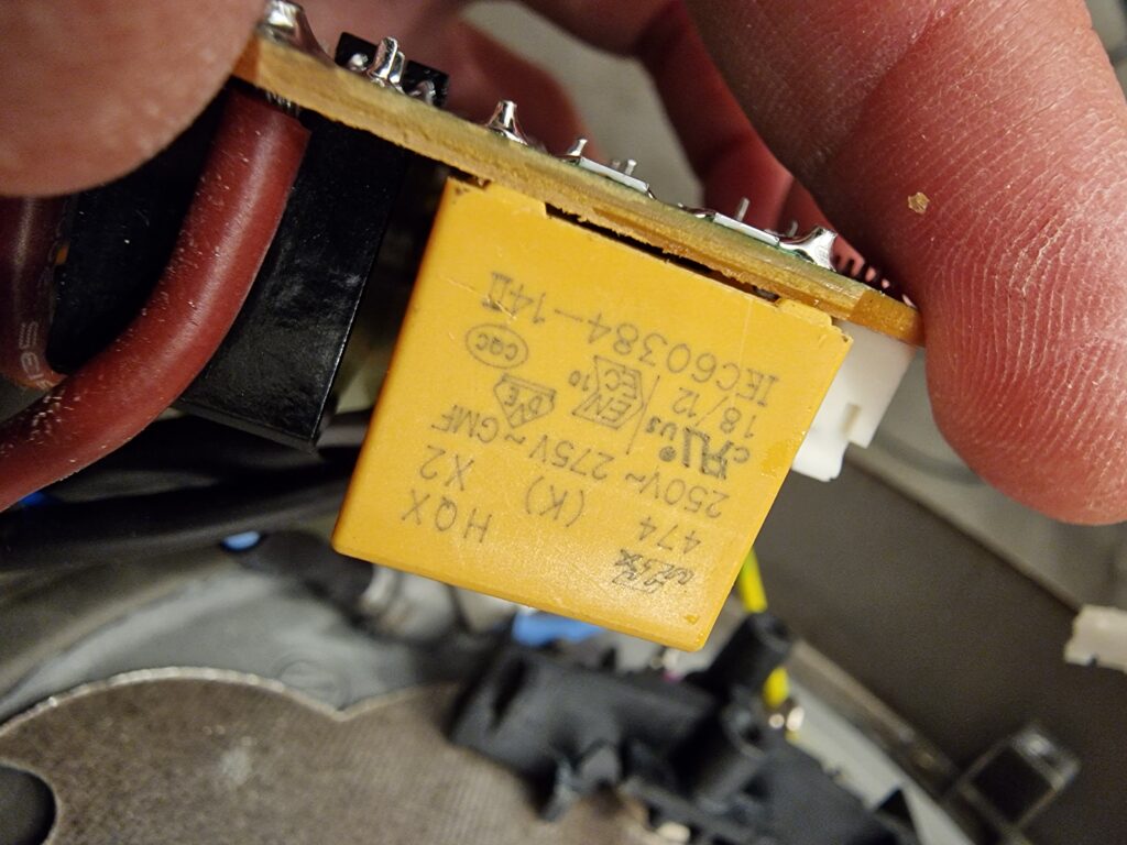 - Condensateur d’origine HQX 474 (K) X2 non adapté pour usage série sur secteur, pas prévu pour haute température et sous dimensionné (470nF)